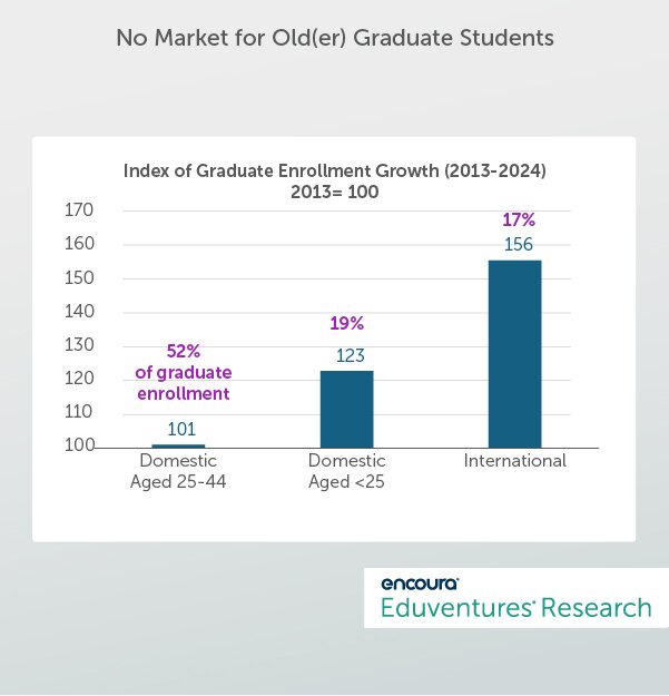 In summary, headline graduate enrollment data obscures that enrollment in the core age group (aged 25-44) has grown more slowly than the underlying population and that international students have compensated for sluggish domestic demand. Younger (domestic) graduate enrollment grew 23% over the period but is a much smaller market.