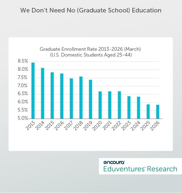 Source: Eduventures analysis of Current Population Survey (CPS) data from the U.S. Census Bureau (via IPUMS - University of Minnesota). “Graduate Enrollment Rate” is defined by Eduventures as the proportion of Americans aged 25-44 with a bachelor’s degree as their highest credential who reported enrollment at a college or university. Most enrollment is assumed to be graduate. March is when the largest CPS survey (Annual Social & Economic Supplement) is conducted each year. March 2026 data is estimated from January and February figures.