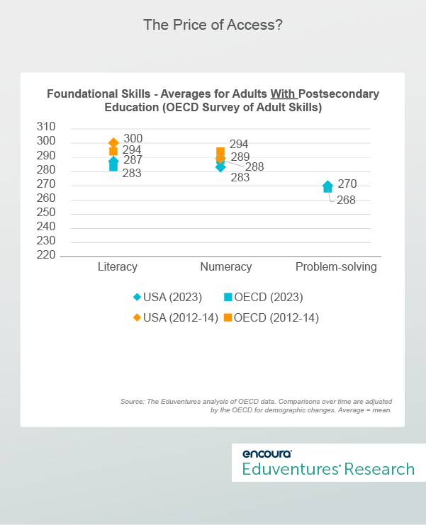 It is perplexing that after a decade when U.S. postsecondary attainment continued to climb—on the assumption that students and society would be better off—foundational skills proficiency slipped and is further behind the rich-country average. Perhaps weaker performance is the price of wider access, but that is a dispiriting take on the college promise. Indeed, Americans scoring on the lower end of the range on literacy and numeracy did worse over time, but scores on the higher range were higher on average in 2023 versus the first cycle.